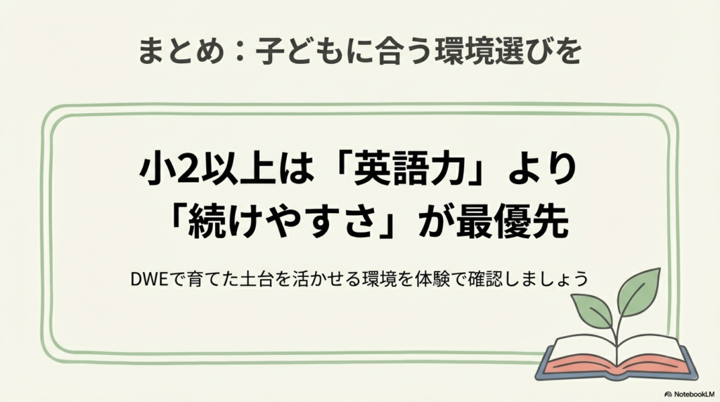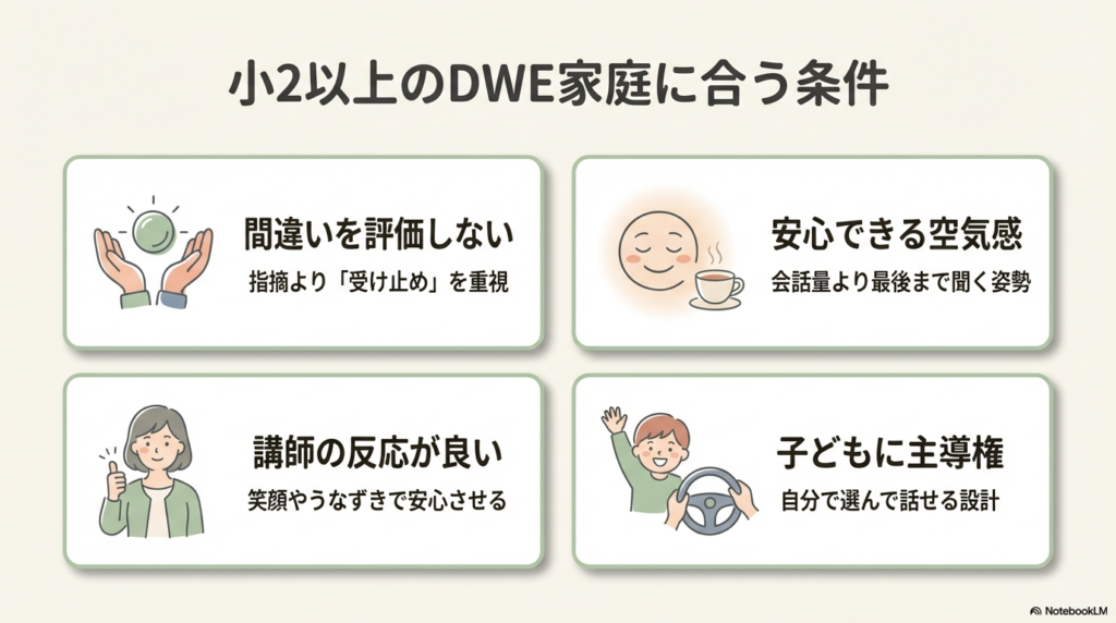 小学2年生以上のDWE家庭がオンライン英会話を選ぶときは、「どれだけ話せるか」「どれだけ進むか」よりも、どう話せるか・どう受け止められるかを重視することが大切です。