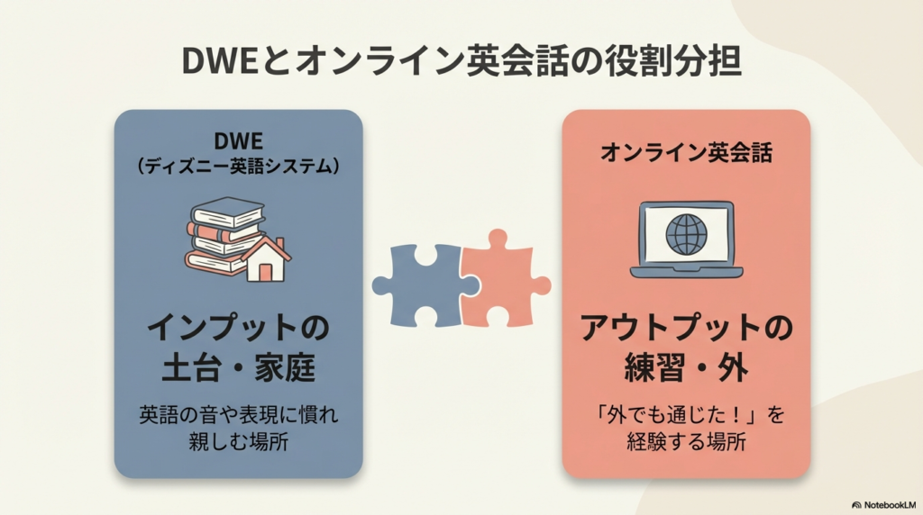 小2以上のDWE家庭がオンライン英会話を取り入れるときに大切なのは、DWEとオンライン英会話を同じ役割として考えないことです。