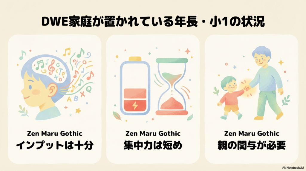 年長・小1のお子さんはインプット十分でも、集中力は短めなので親の関与がまだ必要な時期。