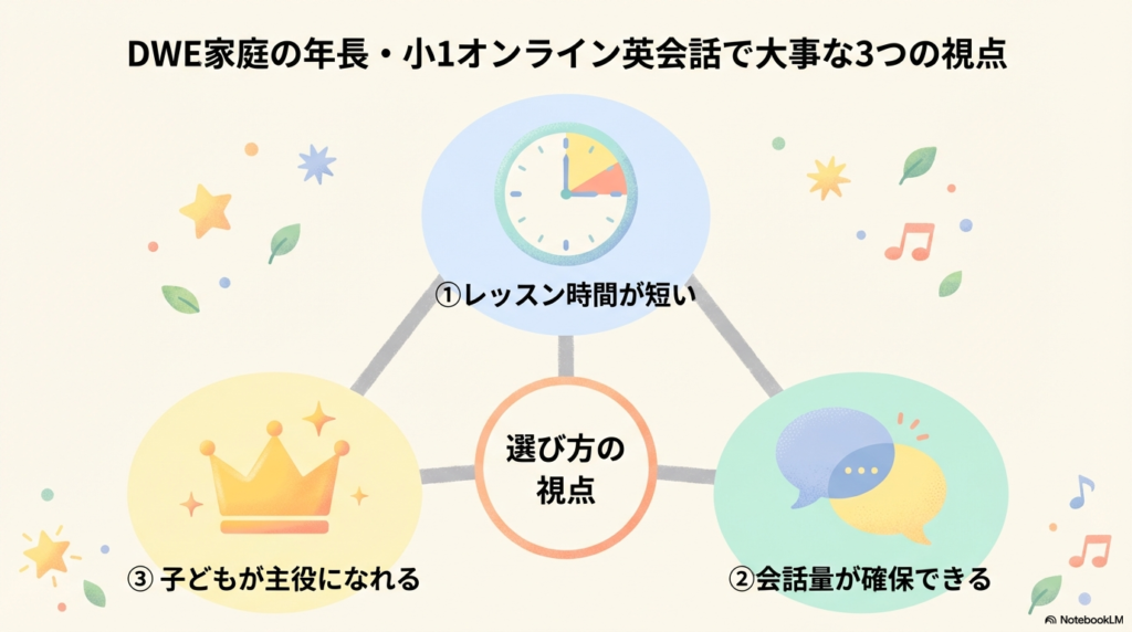年長・小1の時期は、「何を学ぶか」よりも「どんな雰囲気で英語に触れるか」が大切。こうした視点を意識してオンライン英会話を見ると、サービスごとの違いが分かりやすくなります。