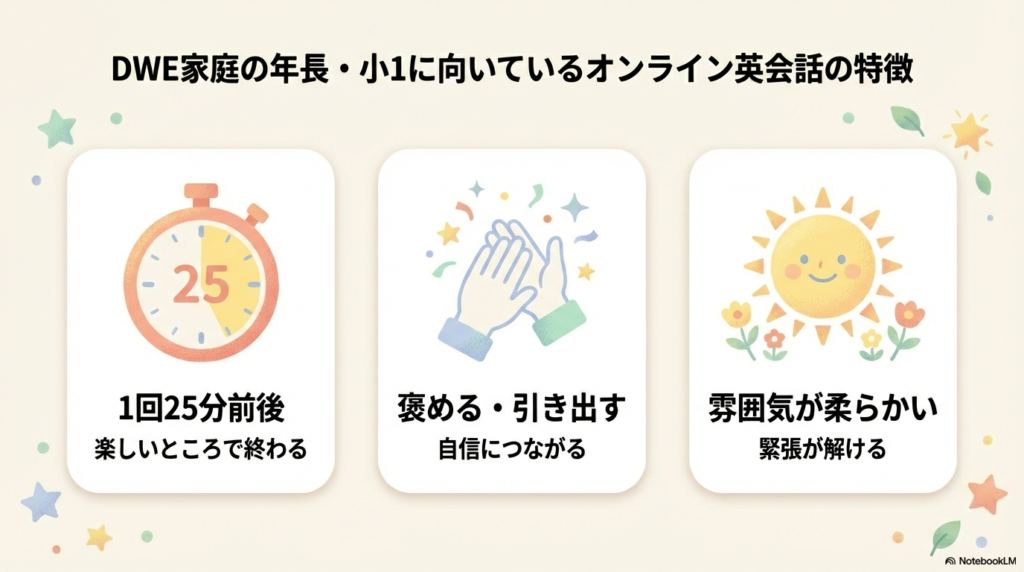 そのため、年長・小1のDWE家庭には、教材よりも「会話そのもの」を楽しめるスタイルの方が、無理なく続きやすいと感じています。