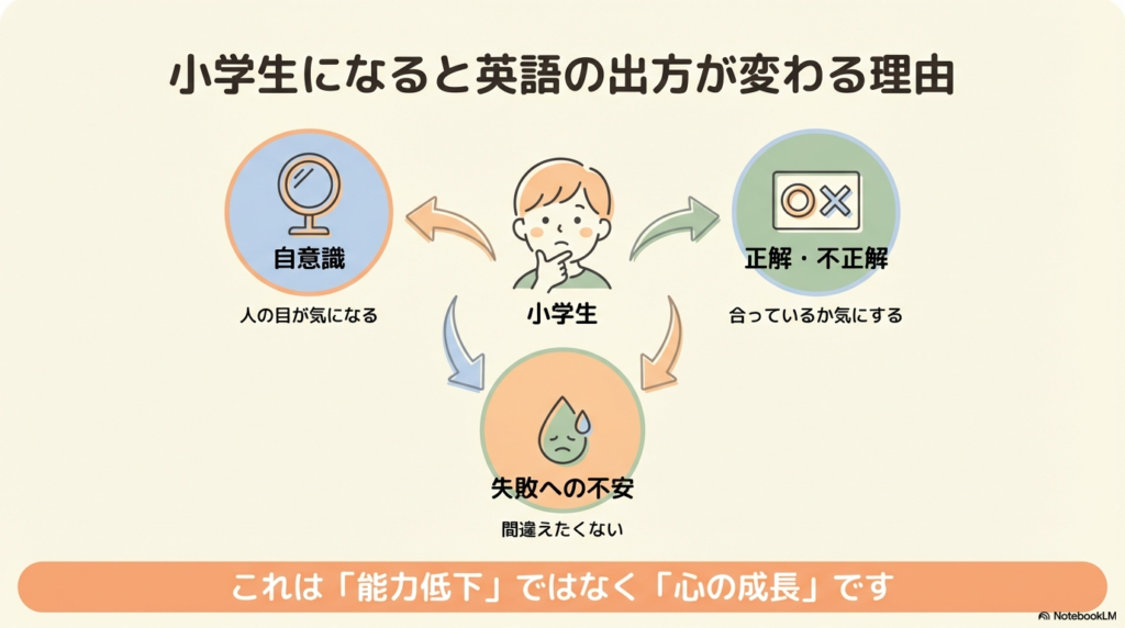 年長や小1の頃に英語が自然に出ていた経験があると、今の慎重な様子を見「後退しているのでは?」と不安になりやすくなります。