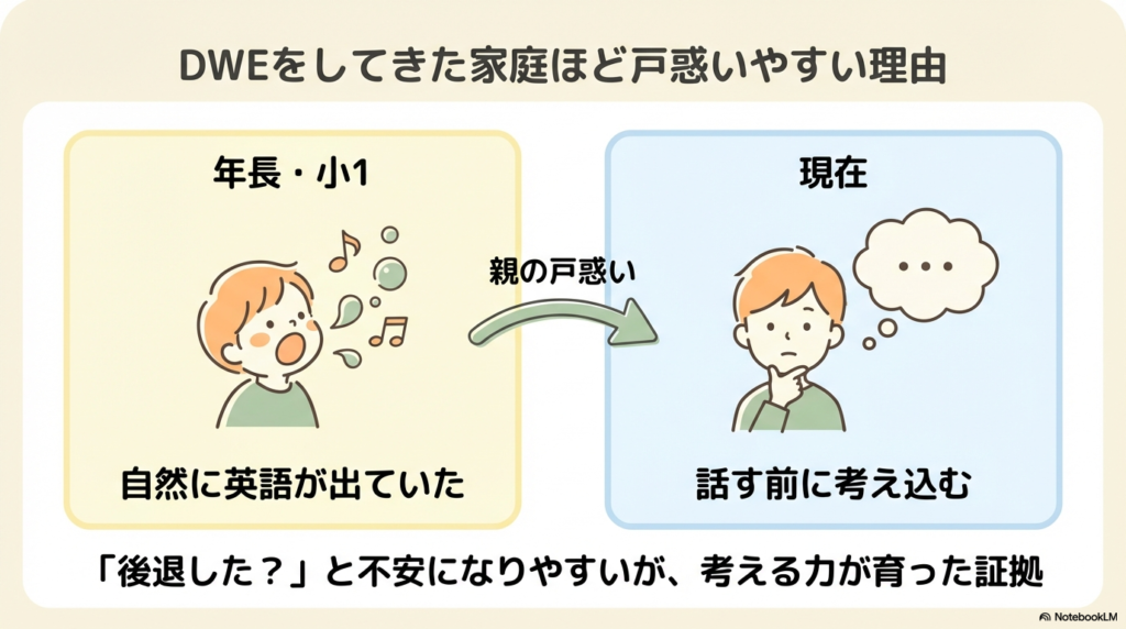 こうした背景が重なることで、DWE家庭ほど英語の変化に敏感になり、戸惑いやすくなるのです。