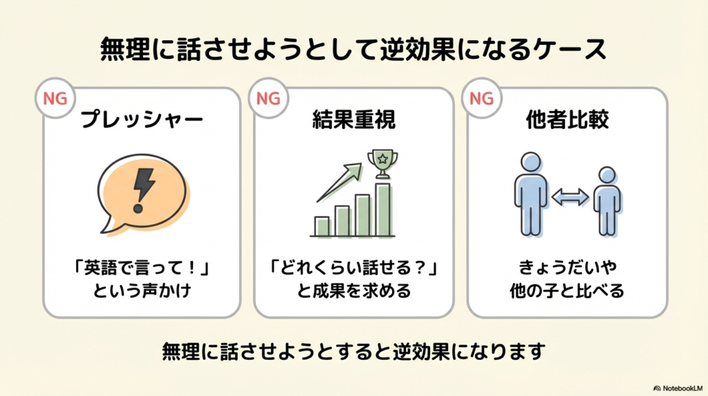 「英語で言ってみよう」「前はできてたよね」といった何気ない声かけが、この時期の子どもにとってはプレッシャーになってしまうことも少なくありません。