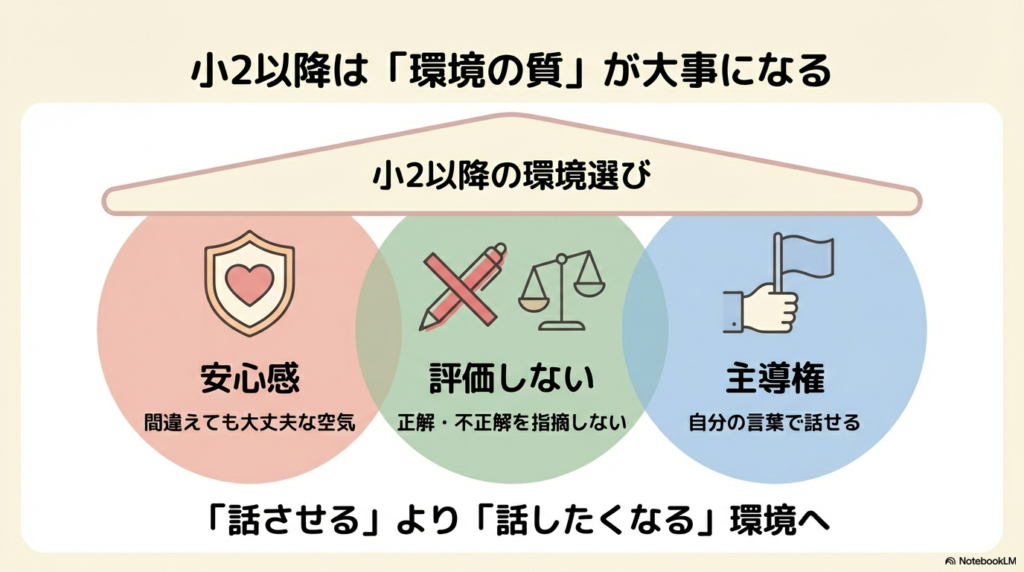 小2以降の英語環境を考えるとき、大切なのは「どれだけ話すか」よりも、どんな環境で話しているかです。