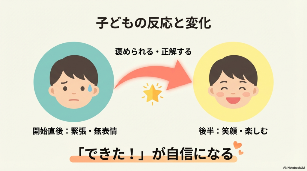 最初の1〜2分は、表情が固かったり声が小さかったりして「緊張してるな…」と感じることも。でも、褒められたり、簡単な質問に答えられたりすると一気に安心して、だんだん笑顔に◎