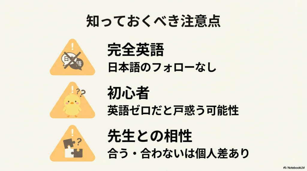 実際に無料体験を受けてみて、「ここは事前に知っておいた方がいいな」と感じた点もありました。体験後にギャップを感じないためにも、事前に知っておいて損なしの情報をまとめていきます。