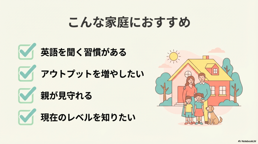 おうち英語や英語教材でインプットを続けてきた家庭ほど、「どれくらい話せるようになっているのか」を確認する機会は意外と少ないものです。