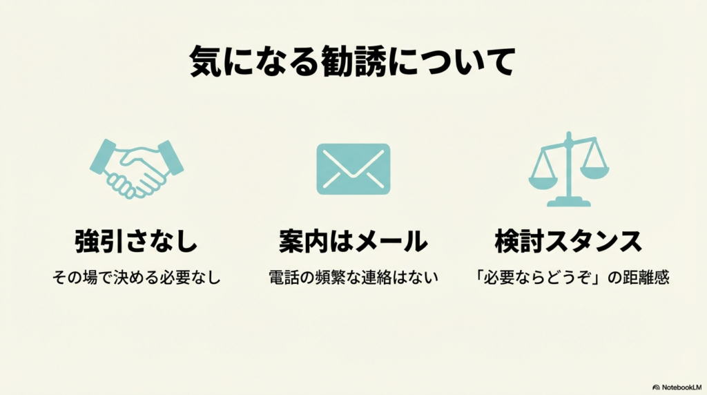 ただし、説明=勧誘という感じではなく、「必要なら検討してくださいね」という距離感。