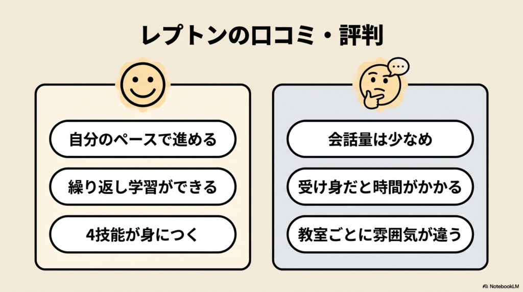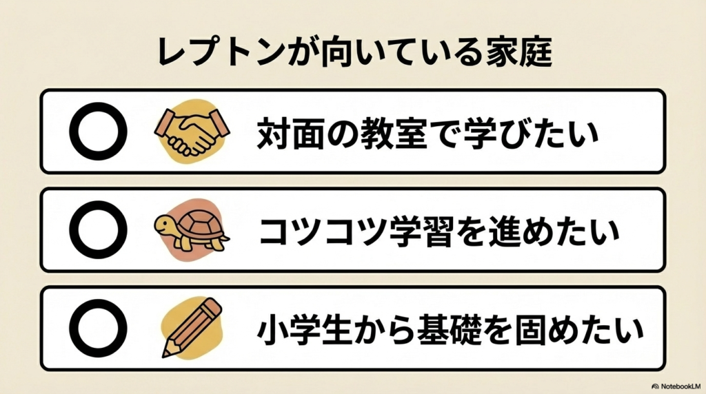レプトンにはこのような口コミがありますが、子どもの性格や学習スタイルによって向き不向きがあります。
