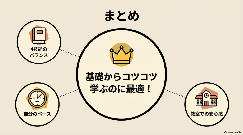 自分のペースでコツコツ英語を積み上げていくことができます。