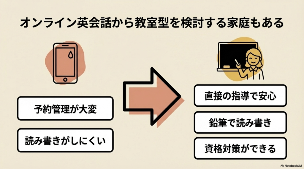そのため、オンラインで会話力を伸ばしながら、 教室型で基礎や読み書きを補うという選択をする家庭もあります。