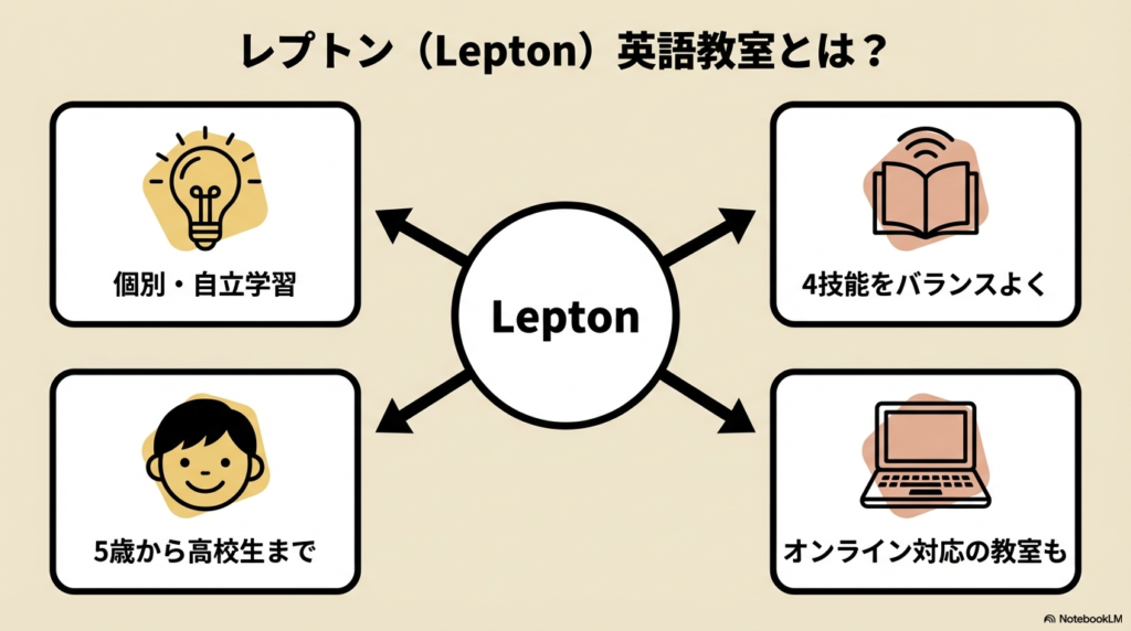 レプトン(Lepton)は、個別・自立学習型で英語4技能をバランスよく学べる子ども向け英語教室です。