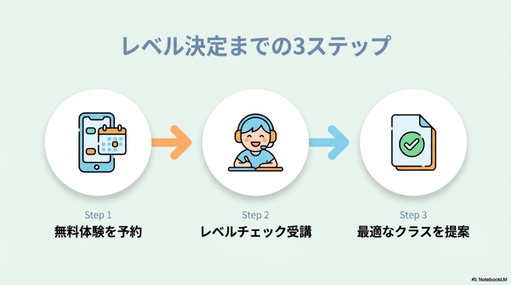 「どのレベルを選べばいいの?」と迷う必要はなく、無料体験レッスンで講師が最適なレベルを判断してくれるので安心です。