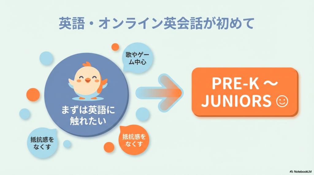 とはいえ、子どもの英語経験によっておすすめのスタート位置には目安があります。ここでは、よくあるタイプ別におすすめレベルをまとめました。