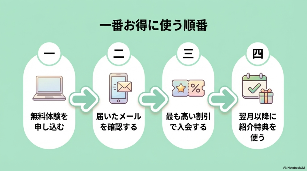 目安:割引コードが1,500円以上の節約になるなら割引コード優先。それ以下なら紹介コードを使い、翌月以降に割引コードを活用するのがベストです。