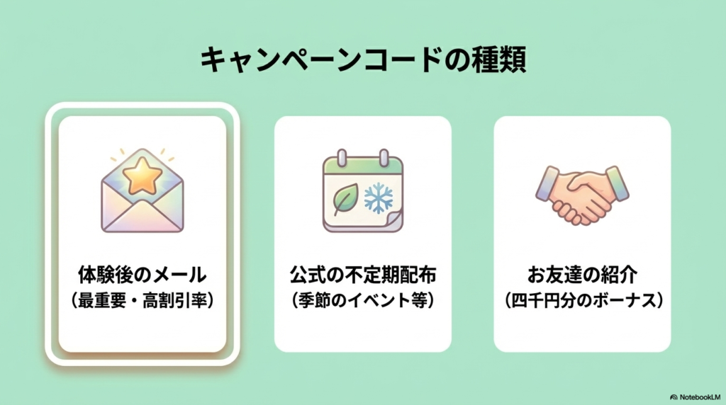 Novakidのキャンペーンコードは、大きく分けて「無料体験後に届くもの」と「公式が不定期で配布するもの」の2種類があります。