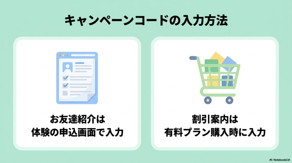 ※ プロモコードとお友達紹介コードの初回同時利用はできませんが、翌月以降の組み合わせは可能です。