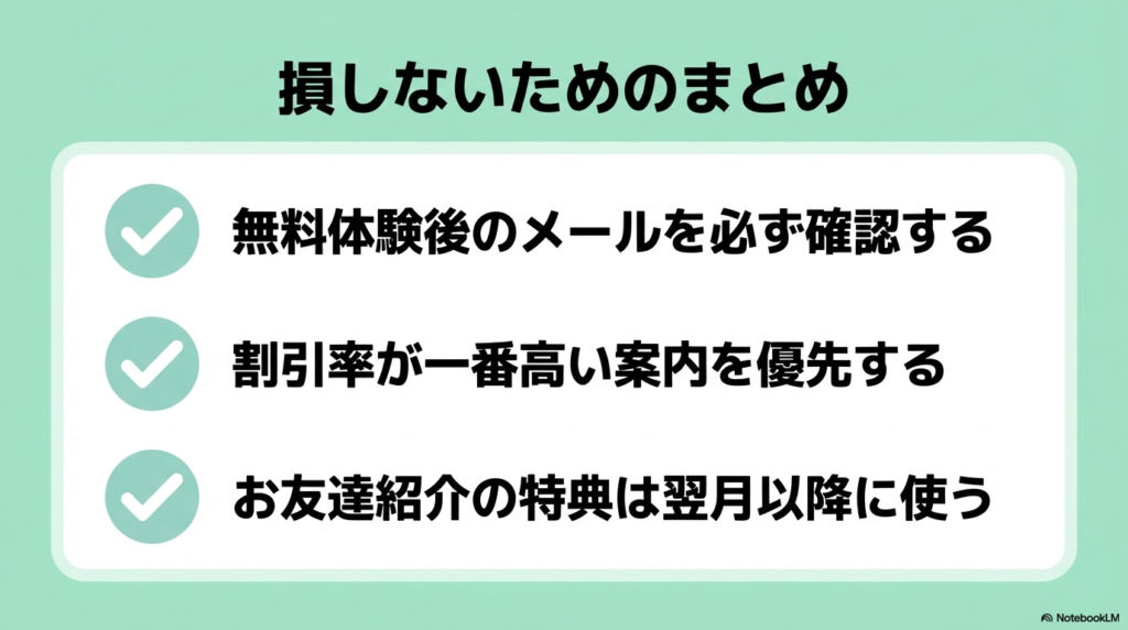 - 無料体験後のメールを必ず確認する(30%OFFが届くことも!)