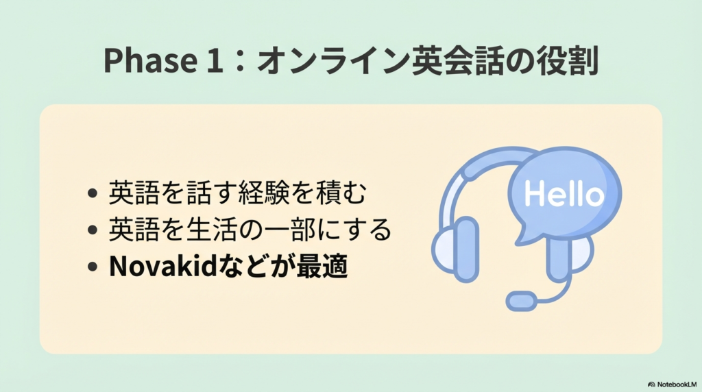 この段階では、ノバキッドのようなオンライン英会話がとても効果的な役割を果たします