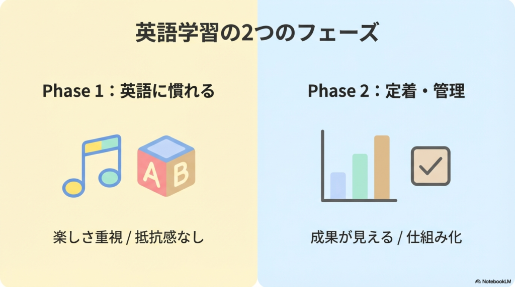 この段階では、「楽しく続けること」に加えて、定着・管理・成果といった視点がより重要になってきます。英語学習は、どこから始めても間違いではありません。ノバキッドのように英語に慣れるフェーズから入る家庭もあれば、最初から成果や管理を重視したフェーズを選ぶ家庭もあります。