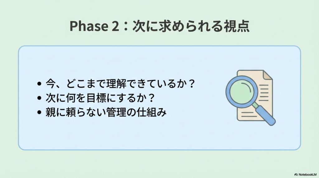 英語学習が次のフェーズに進むと楽しいだけでなく、「成果」や「管理」を意識し始める家庭も増えてきます。例えば、こんな点です。