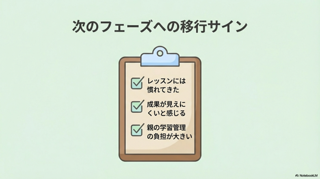 そのため、このまま続けていて大丈夫なのか、次は何を目標にすればいいのかと迷い始める家庭も少なくありません。