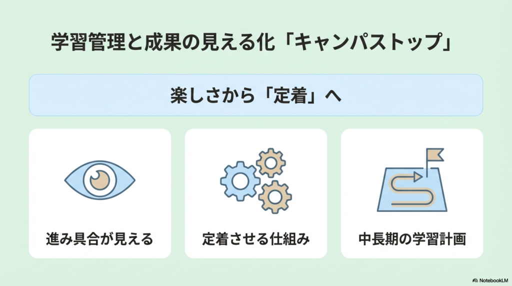 キャンパストップは、「楽しく触れる」段階から、「身につける」「定着させる」段階へ進みたい家庭に向けて、学習の進み具合や到達度を確認しやすい仕組みが整えられたサービスです。