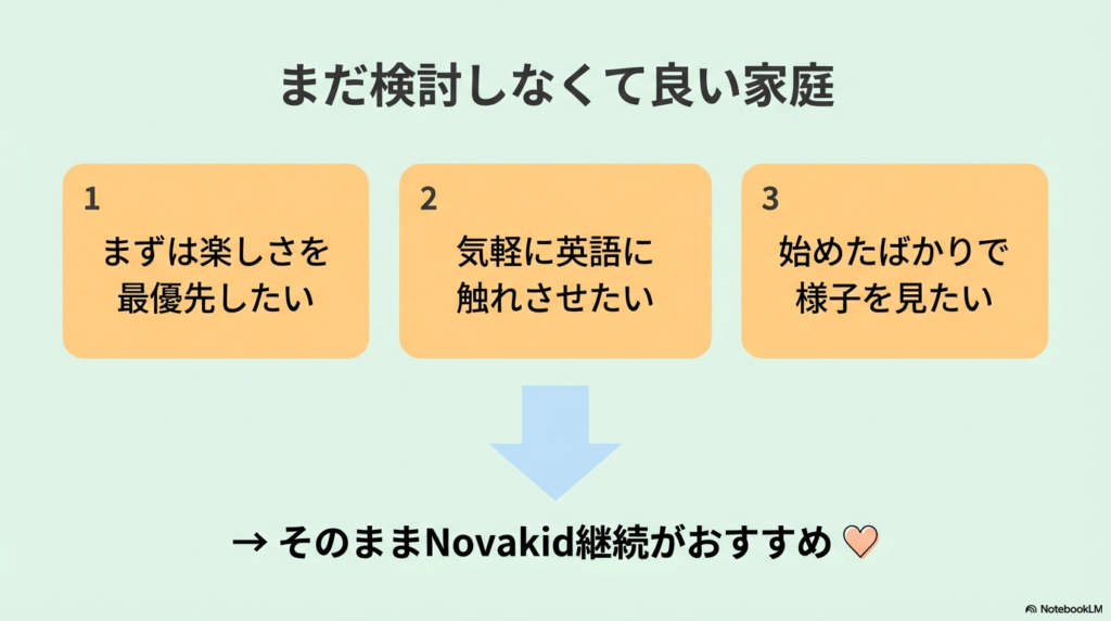 この段階では、ノバキッドのようなオンライン英会話はとても効果的な役割を果たします。インプット中心の学習をしてきた家庭にとっても、実際に英語を声に出して使う経験は、次のステップにつながりやすくなります。