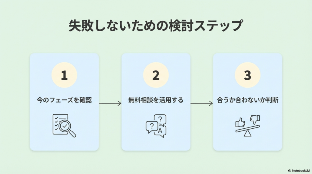 「今すぐ始めるべきか」ではなく、「今のフェーズに合っているか」という視点で話を聞くことが大切です。