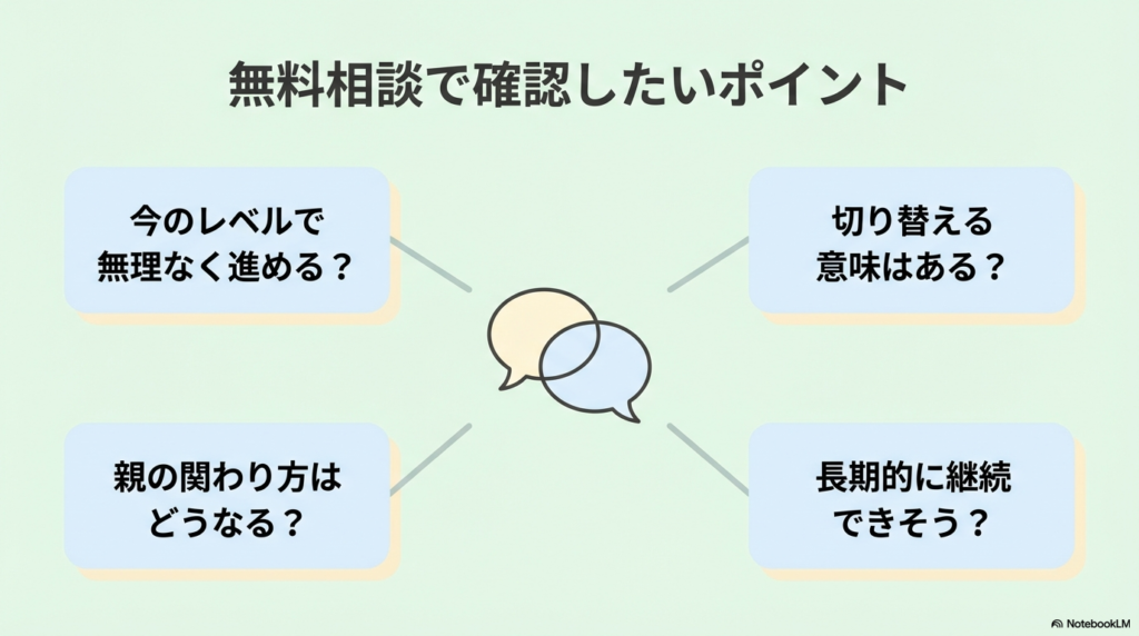 この段階では、「楽しいかどうか」だけでなく、成果が見え、学習が継続しやすいかどうか という観点で学び方を見直すことが、次のステップにつながります。
