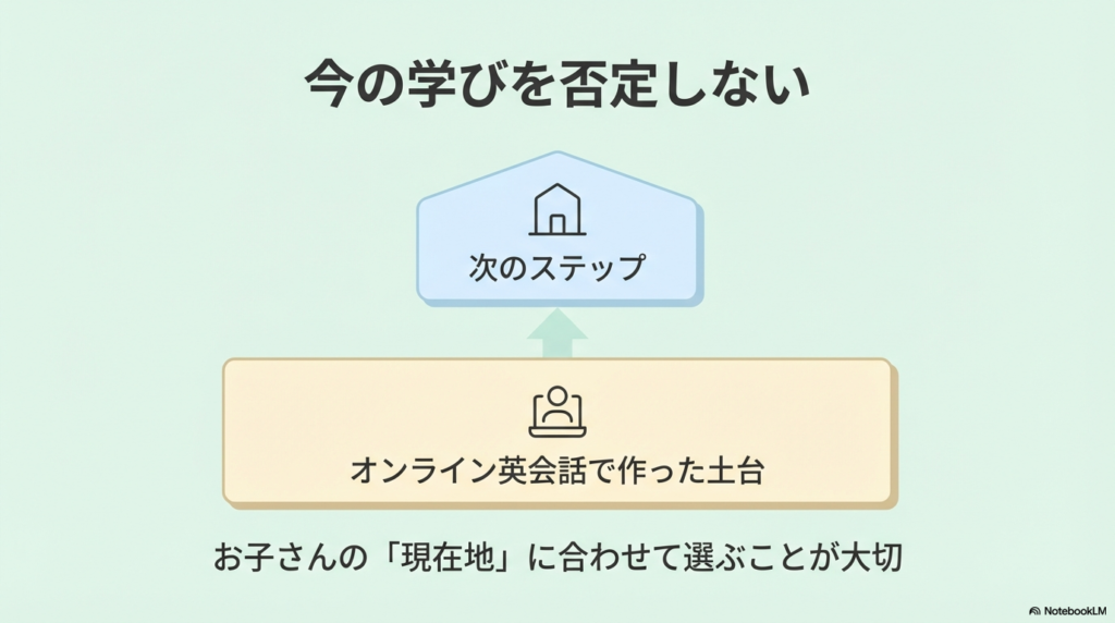 今の学びを否定する必要はありません。ノバキッドなどのオンライン英会話で英語に慣れ、話す土台ができているなら、次に考えるのは「どう伸ばしていくか」だけです。