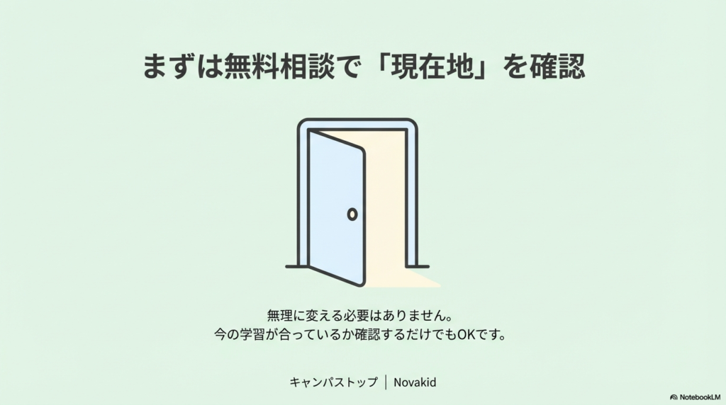 その良さを活かした上で、「次はどう伸ばすか」を考える段階にきた家庭にとって、キャンパストップは一つの選択肢になります。今の学びを否定するのではなく、無料相談を次のステップを考えるための参考としてを活用してみてください。